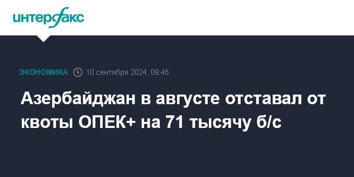 Таким образом, при квоте Азербайджана на 2024 год по добыче нефти в рамках сделки ОПЕК+ 551 тысяча б/с, страна в августе отставала от квоты на 71 тысячу б/с, отмечается в отчете.