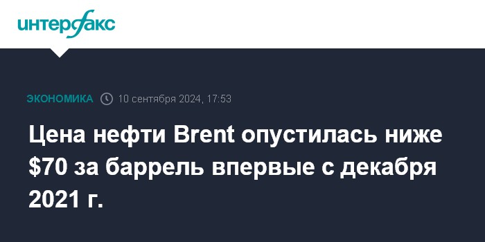 Цена нефти Brent опустилась ниже $70 за баррель впервые с декабря 2021 г.