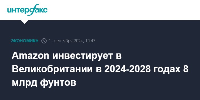 Москва. 11 сентября. INTERFAX.RU - Американская Amazon.com Inc. планирует инвестировать в Великобритании 8 млрд фунтов стерлингов ($10,5 млрд) в ближайшие пять лет.