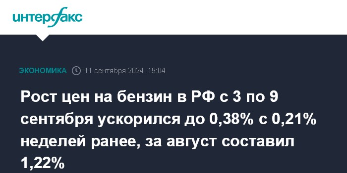 Рост цен на бензин в РФ с 3 по 9 сентября ускорился до 0,38% с 0,21% неделей ранее, за август составил 1,22%