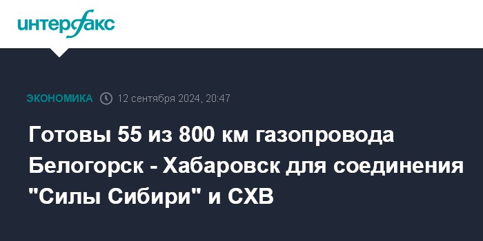 Москва. 12 сентября. INTERFAX.RU - "Газпром" построил 55 из 828 км газопровода "Белогорск - Хабаровск", который соединит "Силу Сибири" и газопровод "Сахалин - Хабаровск - Владивосток", сообщила компания по итогам заседания правления, где рассматривался статус реализации крупнейших инвестпроектов.