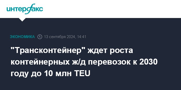 Москва. 13 сентября. INTERFAX.RU - Объем рынка железнодорожных контейнерных перевозок в 2030 году превысит отметку 10 млн TEU, что практически на треть больше уровня 2024 года, сообщил первый вице-президент ПАО "Трансконтейнер" (входит в ГК "Дело") Никита Пушкарев на транспортно-логистической конференции "PRO//Движение.Сибирь" в Новосибирске.
