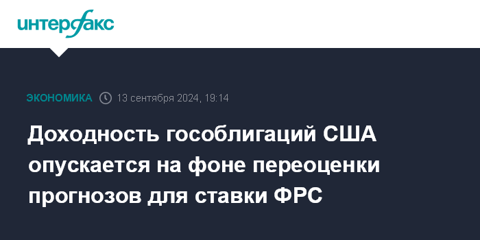 Москва. 13 сентября. INTERFAX.RU - Доходность государственных облигаций США преимущественно снижается в пятницу, поскольку рынок пересматривает оценку вероятности снижения ключевой ставки Федеральной резервной системы сразу на 50 базисных пунктов на сентябрьском заседании.