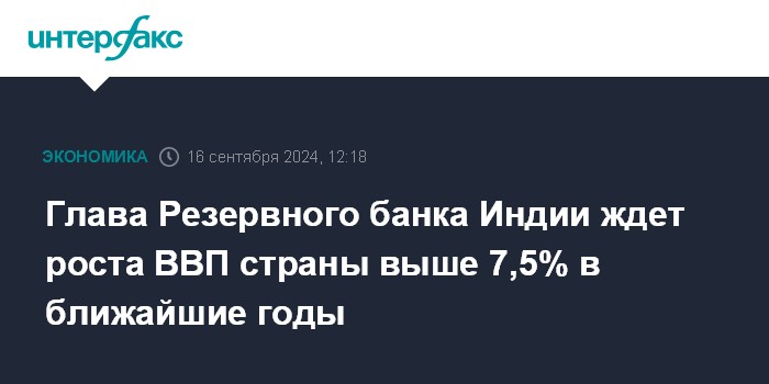 Москва. 16 сентября. INTERFAX.RU - Рост экономики Индии будет превышать 7,5% в ближайшие несколько лет, полагает глава Резервного банка Индии Шактиканта Дас. Такие темпы роста могут поддерживаться в среднесрочной перспективе, заявил он CNBC.