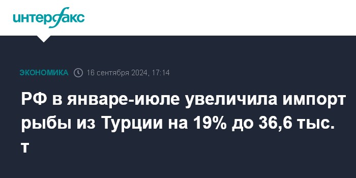 Москва. 16 сентября. INTERFAX.RU - РФ в январе-июле этого года импортировала из Турции 36,6 тыс. тонн рыбы, что на 19% больше, чем за аналогичный период прошлого года, сообщает аналитический центр Рыбного союза со ссылкой на данные таможенной службы Турции.