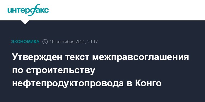 Москва. 16 сентября. INTERFAX.RU - Правительство РФ утвердило текст межправительственного соглашения с Республикой Конго о сотрудничестве в сфере строительства нефтепродуктопровода "Пуэнт-Нуар-Лутете-Малуко-Трешо" в африканской стране.