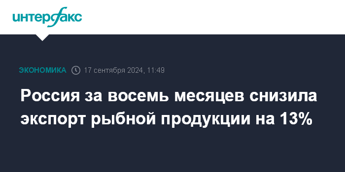 Москва. 17 сентября. INTERFAX.RU - Россия за январь-август 2024 года экспортировала около 1,1 млн тонн рыбной продукции, что на 13% меньше, чем за аналогичный период прошлого года, сообщил помощник руководителя Россельхознадзора Артем Даушев на международном рыбопромышленном форуме в Петербурге.