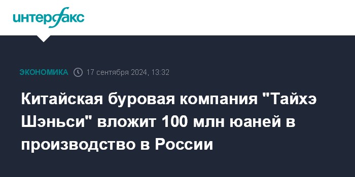 Китайская буровая компания "Тайхэ Шэньси" вложит 100 млн юаней в производство в России