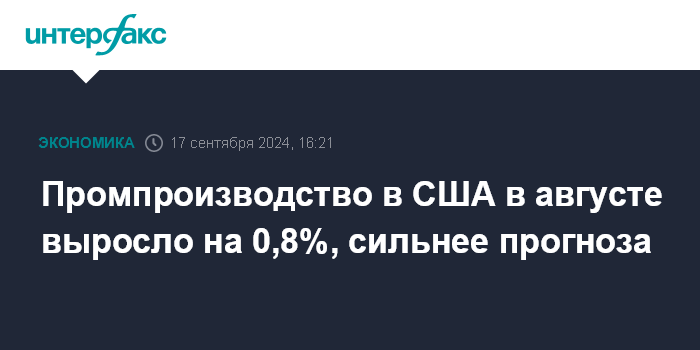 Промпроизводство в США в августе выросло на 0,8%, сильнее прогноза