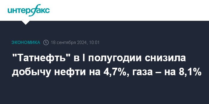 Москва. 18 сентября. INTERFAX.RU - ПАО "Татнефть" в первом полугодии 2024 года добыла 13,66 млн тонн нефти, что на 4,7% меньше показателя аналогичного периода прошлого года, сообщается в отчете эмитента.