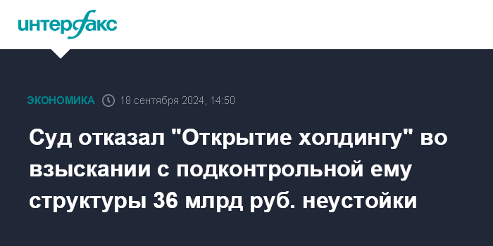 Москва. 18 сентября. INTERFAX.RU - Арбитражный суд Москвы 17 сентября отказал АО "Открытие холдинг" во взыскании с подконтрольной ему Otkritie Investments Cyrpus Limited (Кипр) 36,3 млрд рублей неустойки, следует из картотеки суда.