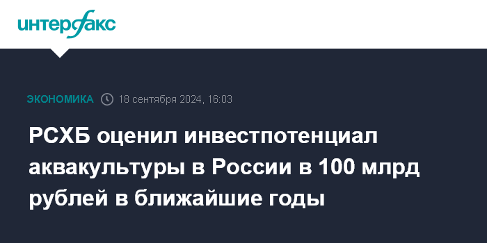 Москва. 18 сентября. INTERFAX.RU - Инвестиционный потенциал отрасли аквакультуры России на горизонте 3-5 лет оценивается в 70-100 млрд рублей, прогнозируют в Россельхозбанке.