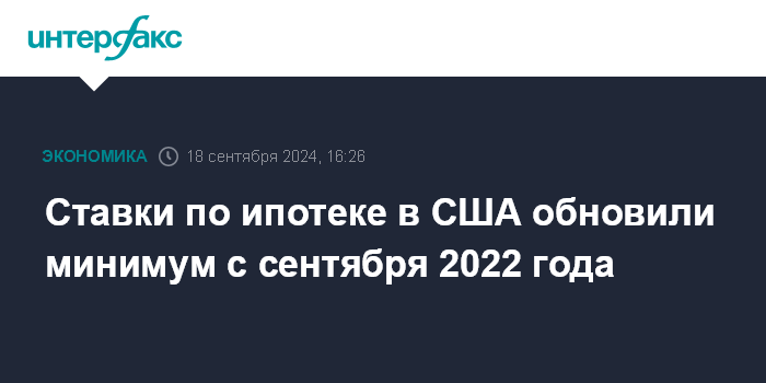 Москва. 18 сентября. INTERFAX.RU - Средний размер ставок по 30-летним ипотечным кредитам в Соединенных Штатах на неделе, завершившейся 13 сентября, упал на 14 базисных пунктов, говорится в сообщении Ассоциации ипотечных банкиров (Mortgage Bankers Association, MBA).