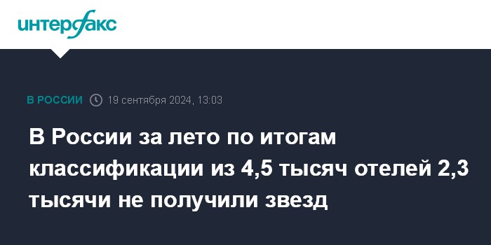 Москва. 19 сентября. INTERFAX.RU - Летом 2024 года аккредитованные органы по классификации средств размещения классифицировали почти 4,5 тысячи российских гостиниц, из них более половины (2,3 тысячи) получили статус "без звезд", сообщиша пресс-служба Росаккредитации.