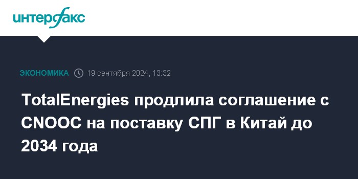 Москва. 19 сентября. INTERFAX.RU - TotalEnergies продлила соглашение о поставках 1,25 млн т сжиженного природного газа (СПГ) с китайской CNOOC (China National Offshore Oil Corporation) на пять лет, до 2034 года, говорится в пресс-релизе французской компании.