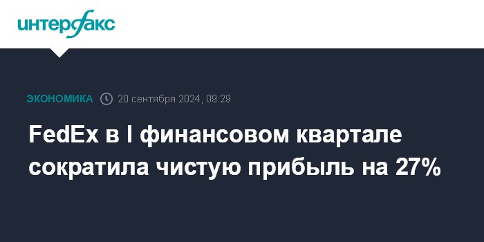 Москва. 20 сентября. INTERFAX.RU - Американская FedEx Corp., одна из крупнейших в мире транспортно-логистических компаний, в первом квартале 2025 финансового года снизила чистую прибыль на 27%, ухудшила годовой прогноз.