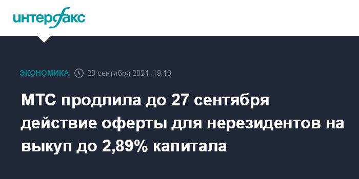 Москва. 20 сентября. INTERFAX.RU - ПАО "МТС" объявило о продлении до 27 сентября дополнительного тендерного предложения на выкуп до 2,89% капитала компании у нерезидентов.
