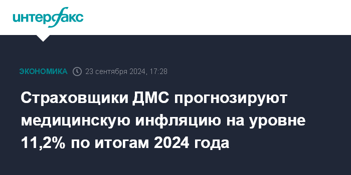 Москва. 23 сентября. INTERFAX.RU - Ведущие страховщики, работающие по программам добровольного медицинского страхования , прогнозируют медицинскую инфляцию по итогам 2024 года на уровне 11,2%, сообщил страховой брокер Remind на основании проведенного опроса.