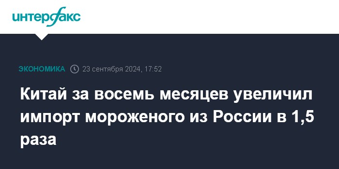 Москва. 23 сентября. INTERFAX.RU - Китай в январе-августе 2024 года импортировал из России мороженого на $2,419 млн, что в 1,5 раза больше, чем за аналогичный период 2023 года ($1,646 млн), сказано в материалах Государственного таможенного управления (ГТУ) КНР.