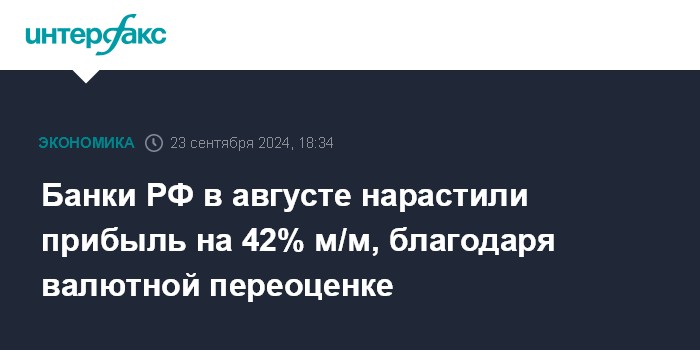 Банки РФ в августе нарастили прибыль на 42% м/м, благодаря валютной переоценке