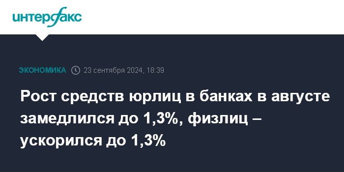 Рост средств юрлиц в банках в августе замедлился до 1,3%, физлиц – ускорился до 1,3%