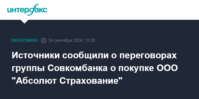 Источники сообщили о переговорах группы Совкомбанка о покупке ООО "Абсолют Страхование"