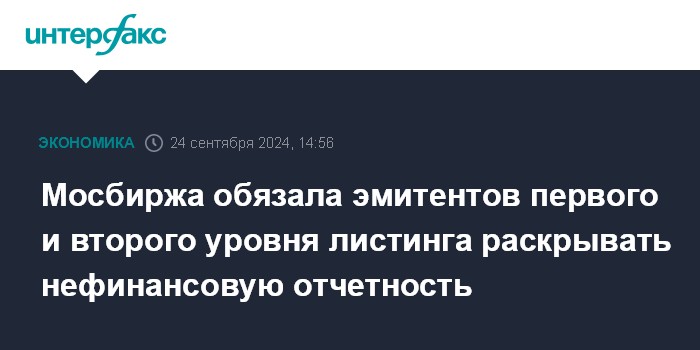 Москва. 24 сентября. INTERFAX.RU - "Московская биржа" разработала новую редакцию правил раскрытия информации, согласно которой компании из первого и второго котировального списка должны будут публиковать нефинансовую отчетность, начиная с данных за 2024 год.