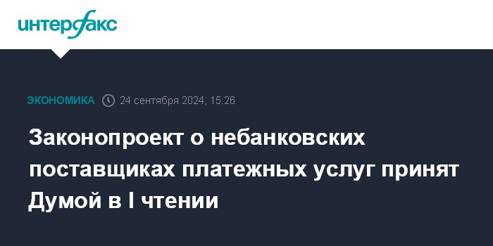 Москва. 24 сентября. INTERFAX.RU - Госдума приняла в первом чтении законопроект о введении института небанковских поставщиков платежных услуг (НППУ), а также связанный с ним законопроект, наделяющий Банк России полномочиями, необходимыми для регулирования, надзора и наблюдения за НППУ.