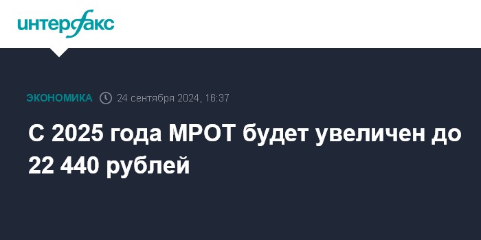 Москва. 24 сентября. INTERFAX.RU - В 2025 году уровень минимального размера оплаты труда будет увеличен до 22440 рублей, что поможет повысить зарплаты порядка 4 млн работников, заявил на заседании правительства премьер-министр Михаил Мишустин.