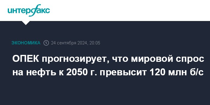Москва. 24 сентября. INTERFAX.RU - Мировой спрос на нефть к 2050 году достигнет 120,1 млн б/с, что на 17,5%, или 17,9 млн б/с больше, чем по итогам 2023 года, сообщается в ежегодном обзоре ОПЕК.