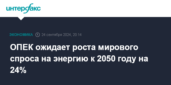 Москва. 24 сентября. INTERFAX.RU - Мировой спрос на энергию к 2050 году достигнет 374,1 млн баррелей нефтяного эквивалента в сутки, что на 24% больше, чем по итогам 2023 года, пишет ОПЕК в своем ежегодном обзоре.
