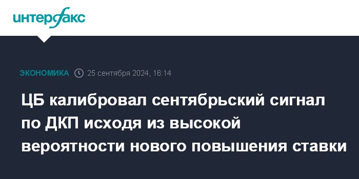 Москва. 25 сентября. INTERFAX.RU - Банк России при выборе формулировки сигнала о будущей направленности денежно-кредитной политики в заявлении по итогам сентябрьского совета директоров исходил из того, что новое повышение ставки высоковероятно.