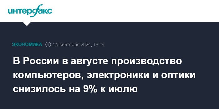 Москва. 25 сентября. INTERFAX.RU - В России в августе производство компьютеров, электронных и оптических изделий сократилось на 9% по сравнению с июлем, сообщает Росстат.