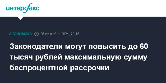 "Мы либо увеличим до 60 тысяч рублей, либо вообще рассрочку беспроцентную уберем из этого регулирования. (...) Пока склоняемся к 60 тысячам", - сказал Аксаков.