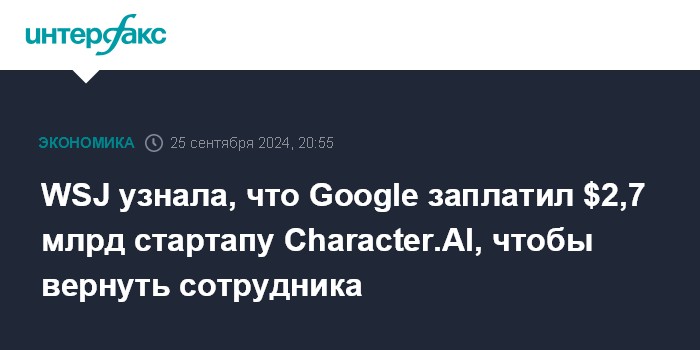 WSJ узнала, что Google заплатил $2,7 млрд стартапу Character.AI, чтобы вернуть сотрудника