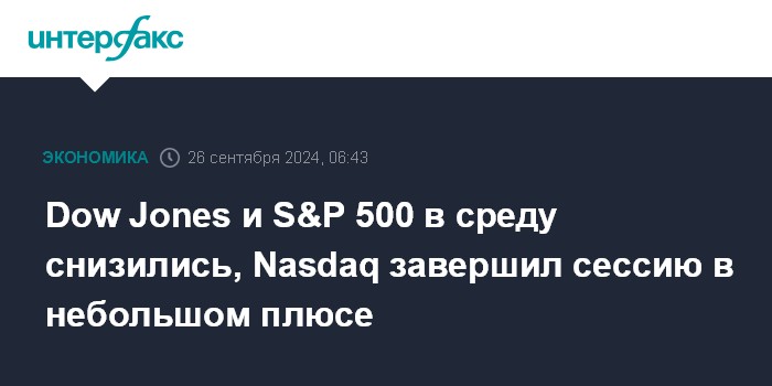 Москва. 26 сентября. INTERFAX.RU - Американские фондовые индексы Dow Jones Industrial Average и S&P 500 снизились по итогам торгов в среду, Nasdaq Composite завершил сессию в небольшом плюсе.