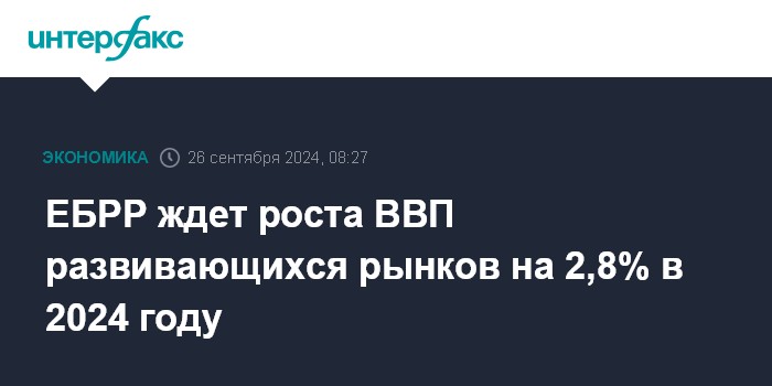 Москва. 26 сентября. INTERFAX.RU - Европейский банк реконструкции и развития прогнозирует рост ВВП развивающихся рынков Европы, Кавказа, Центральной Азии и Северной Африки в 2024 году на 2,8%, в 2025 году - на 3,5%.