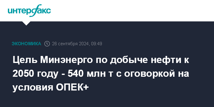 Цель Минэнерго по добыче нефти к 2050 году - 540 млн т с оговоркой на условия ОПЕК+