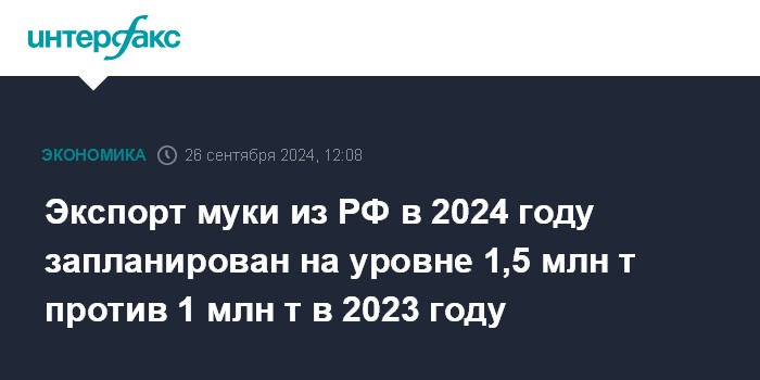 Экспорт муки из РФ в 2024 году запланирован на уровне 1,5 млн т против 1 млн т в 2023 году