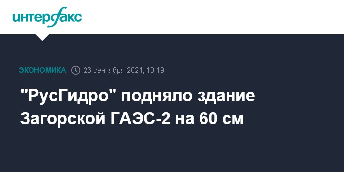 Москва. 26 сентября. INTERFAX.RU - ПАО "РусГидро" удалось поднять на 60 см здание Загорской ГАЭС-2, сообщил журналистам в кулуарах РЭН глава компании Виктор Хмарин.