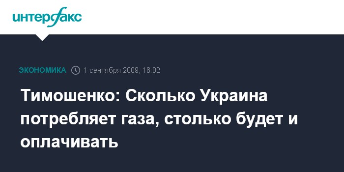 Сопот. 1 сентября. INTERFAX.RU - Украина будет оплачивать столько российского газа, сколько потребляет, заявила премьер-министр Украины Юлия Тимошенко во вторник в Сопоте по итогам переговоров с главой правительства РФ Владимиром Путиным.