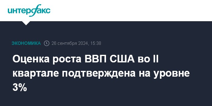 Москва. 26 сентября. INTERFAX.RU - Экономика США во втором квартале 2024 года выросла на 3% в пересчете на годовые темпы, по окончательным данным Министерства торговли США.