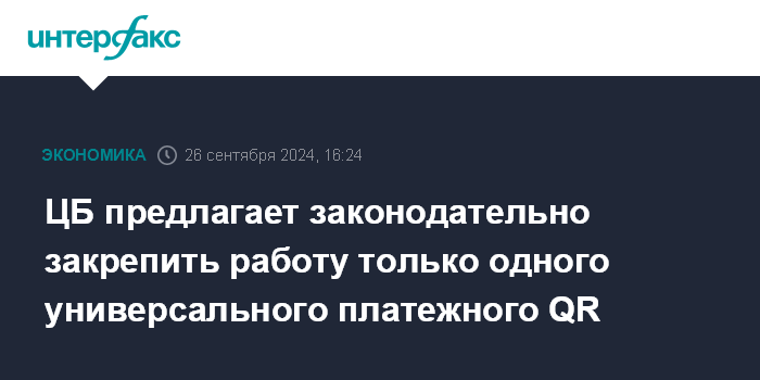 Москва. 26 сентября. INTERFAX.RU - Банк России предлагает законодательно закрепить работу на платежном рынке только одного универсального QR-кода, сообщила глава ЦБ Эльвира Набиуллина.