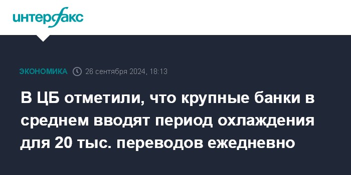 В ЦБ отметили, что крупные банки в среднем вводят период охлаждения для 20 тыс. переводов ежедневно