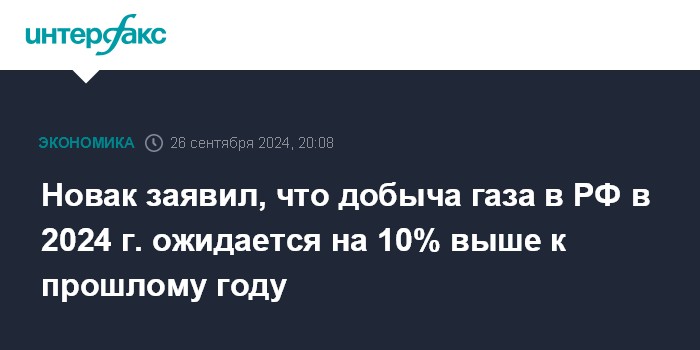 Москва. 26 сентября. INTERFAX.RU - Добыча газа в России в 2024 году вырастет примерно на 10% к предыдущему году, сообщил вице-премьер РФ Александр Новак в интервью телеканалу "Россия 24".