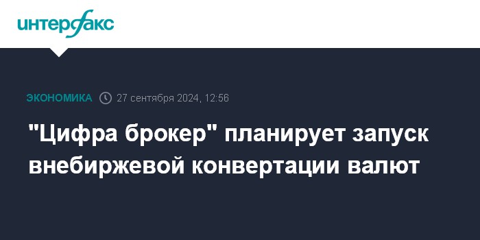 Москва. 27 сентября. INTERFAX.RU - "Цифра брокер" планирует запустить внебиржевую конвертацию валюты, в частности, доллара США, сообщил "Интерфаксу" представитель брокера.