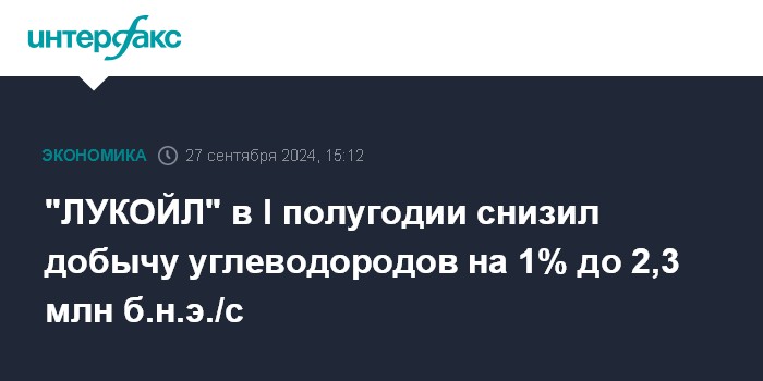 Москва. 27 сентября. INTERFAX.RU - Добыча углеводородов "ЛУКОЙЛом" по итогам 6 месяцев 2024 года составила 2,289 млн баррелей нефтяного эквивалента в сутки, что на 1% меньше, чем годом ранее, говорится в отчете компании.