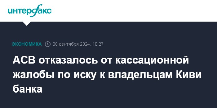 Москва. 30 сентября. INTERFAX.RU - Агентство по страхованию вкладов (АСВ) подало ходатайство об отказе от кассационной жалобы по иску к владельцам Киви банка об оспаривании сделки по продаже АО "Киви", следует из картотеки Арбитражного суда Москвы.
