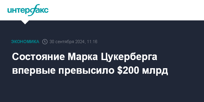 Москва. 30 сентября. INTERFAX.RU - Состояние основателя и главы Meta (признана в России экстремистской организацией и запрещена) Марка Цукерберга впервые превысило $200 млрд за счет подорожания акций его компании.
