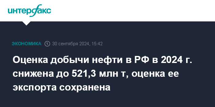 Оценка добычи нефти в РФ в 2024 г. снижена до 521,3 млн т, оценка ее экспорта сохранена